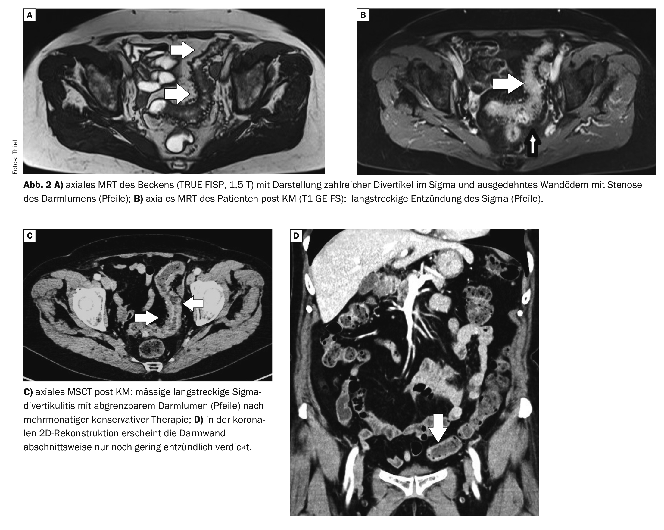 L’IRM est également devenue un outil précieux pour le diagnostic intestinal. Les séquences multiplanaires sans et avec saturation des graisses, ainsi que les séquences assistées par contraste, permettent de détecter avec certitude la diverticulose et la sigmoïdite [6]. Un avantage par rapport au scanner est l’absence d’exposition aux radiations, un inconvénient est la durée plus longue de l’examen et le risque plus élevé d’artefacts, ainsi que la contre-indication des stimulateurs cardiaques, en particulier chez les patients âgés.