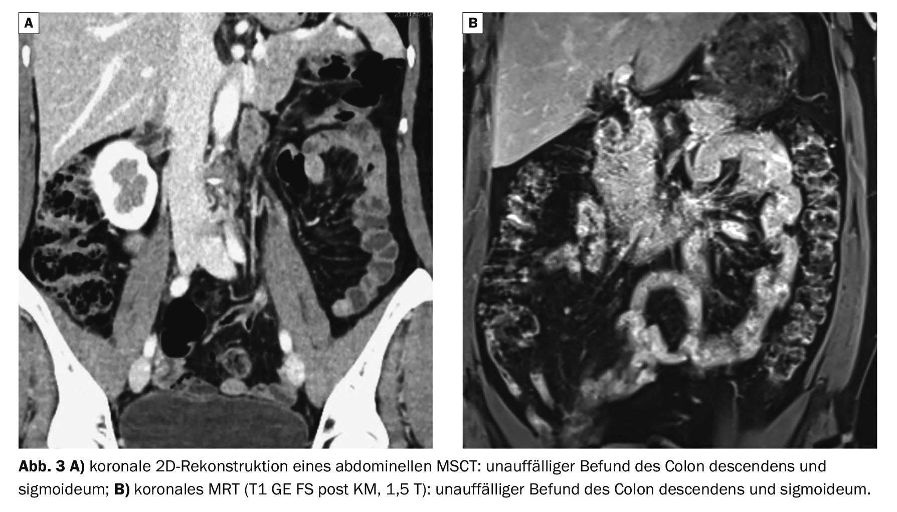Dans l’exemple 3 , les résultats normaux du côlon sigmoïde au scanner (Fig. 3A) et à l’IRM (Fig. 3B) sont présentés à titre de comparaison.